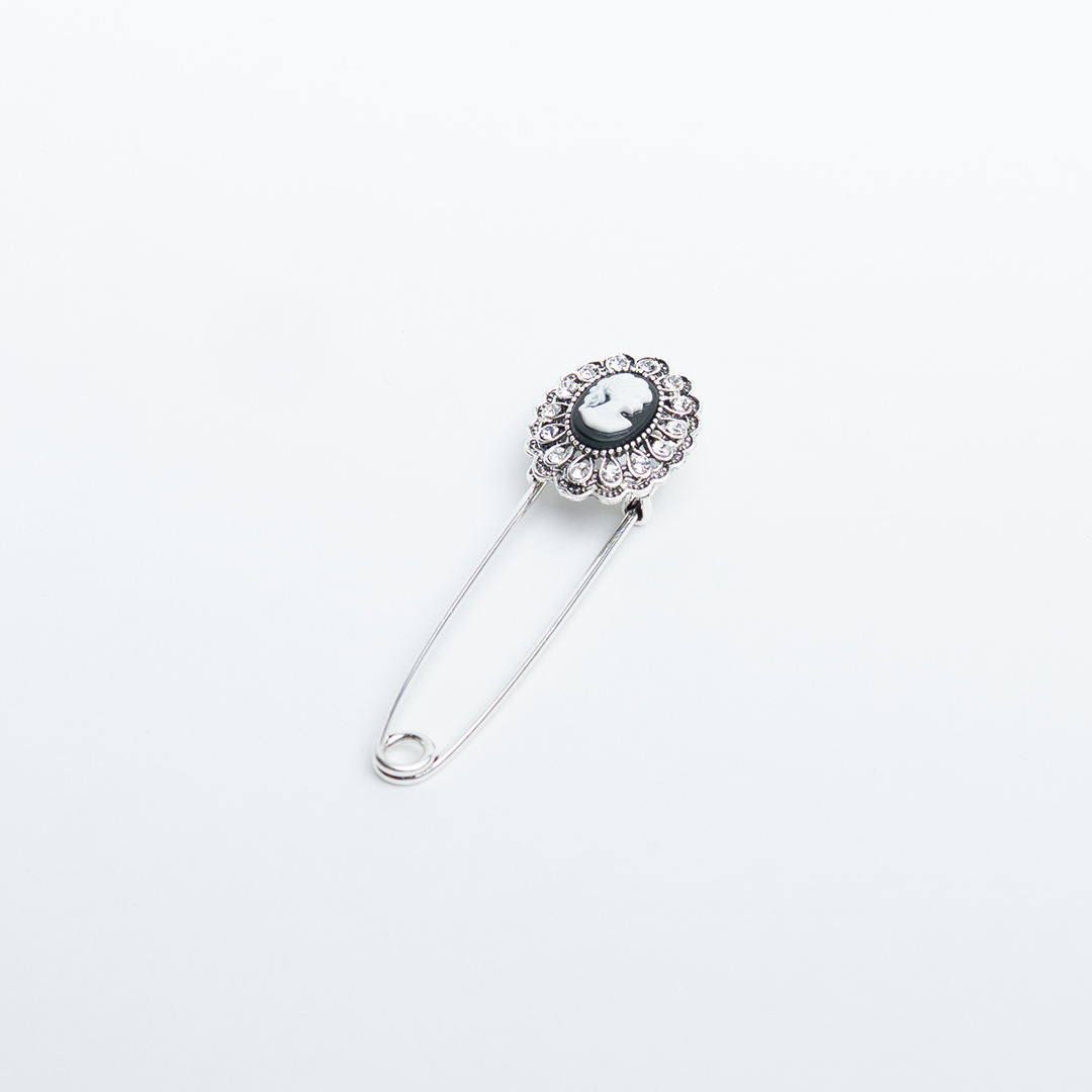 Broșă argintie atent lucrată în formă de ac de siguranță cu o frumoasă camee înconjurată de pietre.