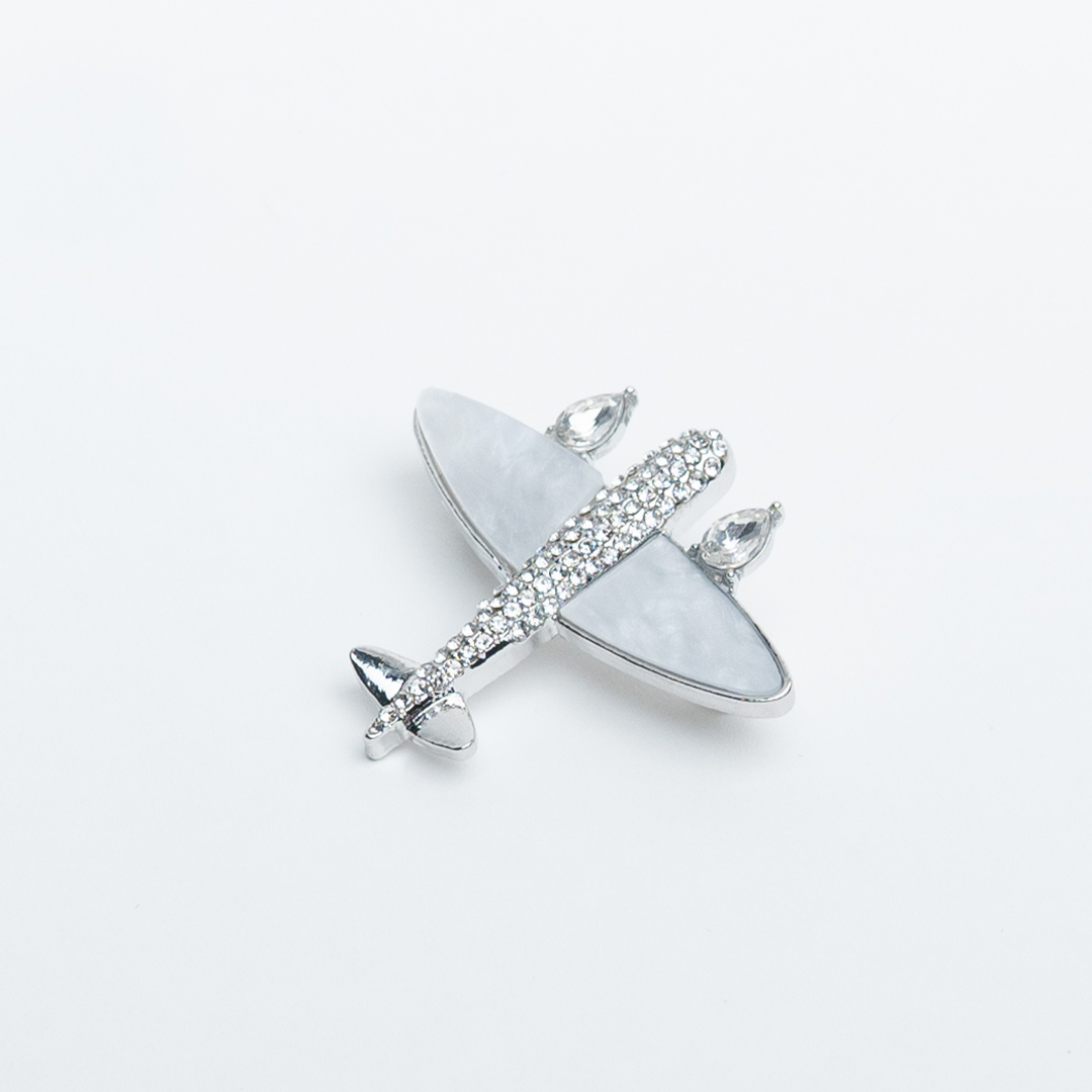 Broșă argintie în formă de avion cu aripile atent placate cu sidef.