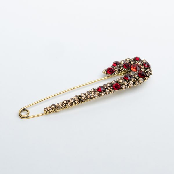 Broșă în formă de ac de siguranță atent lucrat cu pietre în diferite nuanțe de roșu și auriu.