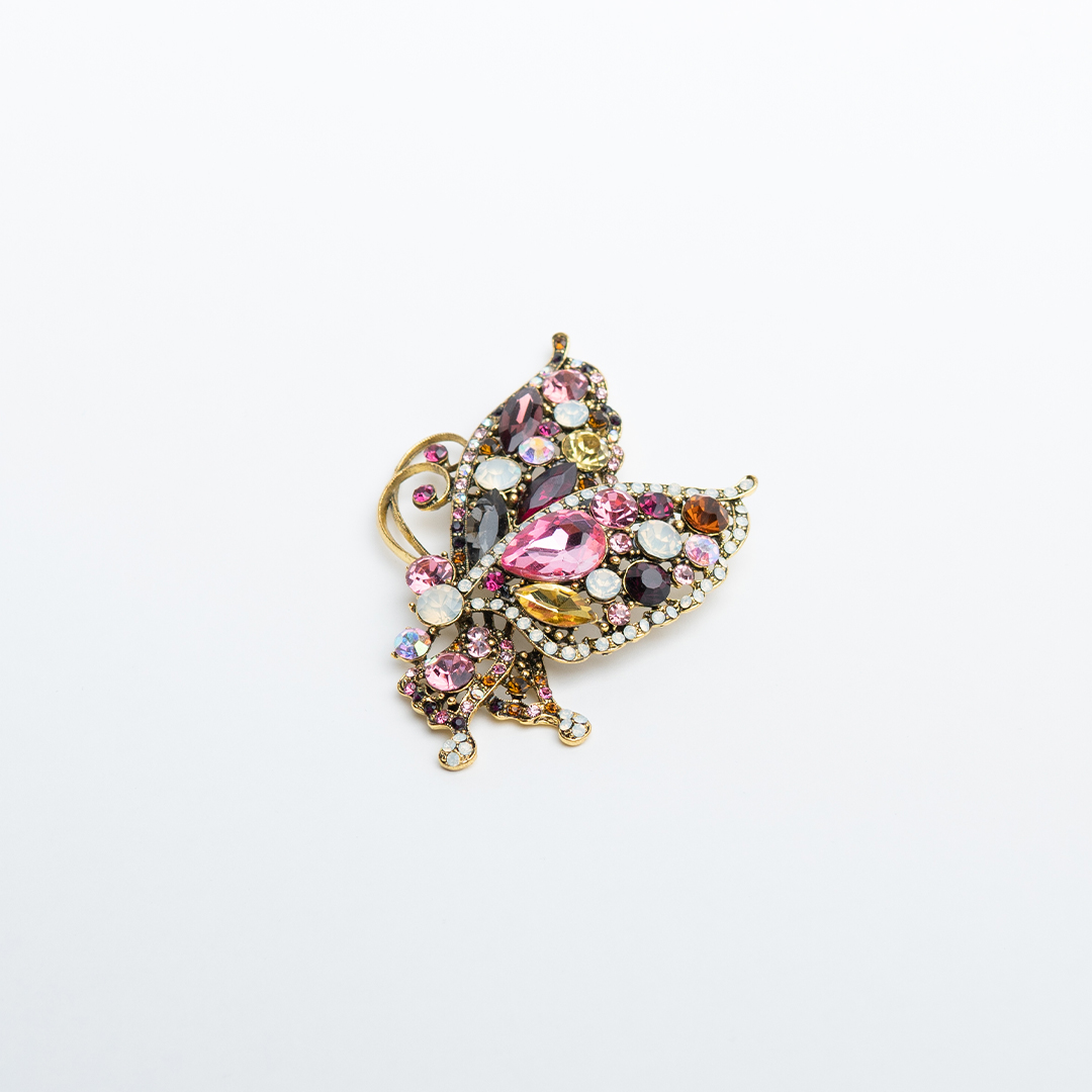 Broșă în formă de fluture cu pietre în diferite nuanțe de grena, roșu, roz, alb și auriu.