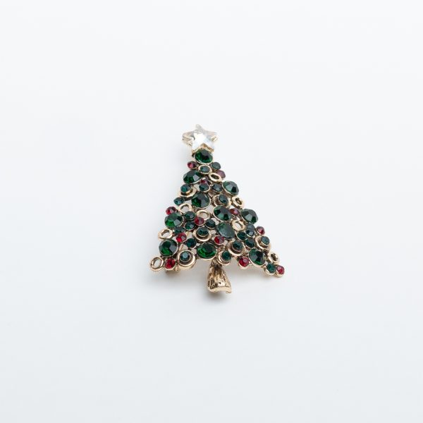 Broșă aurie atent lucrată în formă brad de Crăciun împodobit cu pietre.