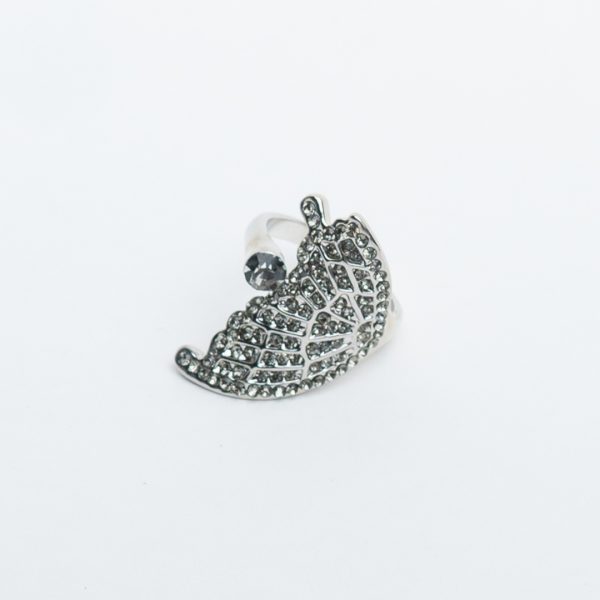 Inel argintiu atent lucrat în formă de aripă cu numeroase pietre gri.